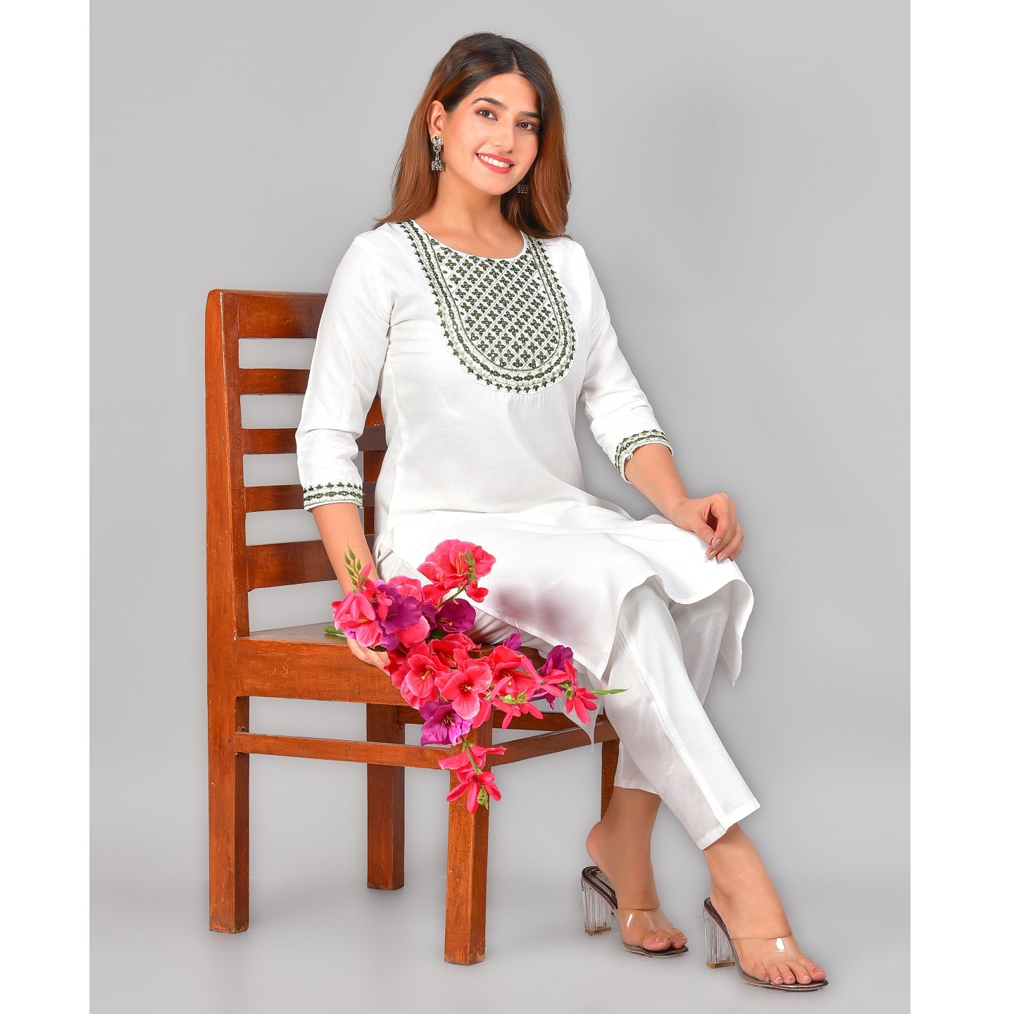 Exclusive white green embroidered cotton blend straight kurta pant set for women, this Kurta pant is made up of 100% good material and available in multicolor...