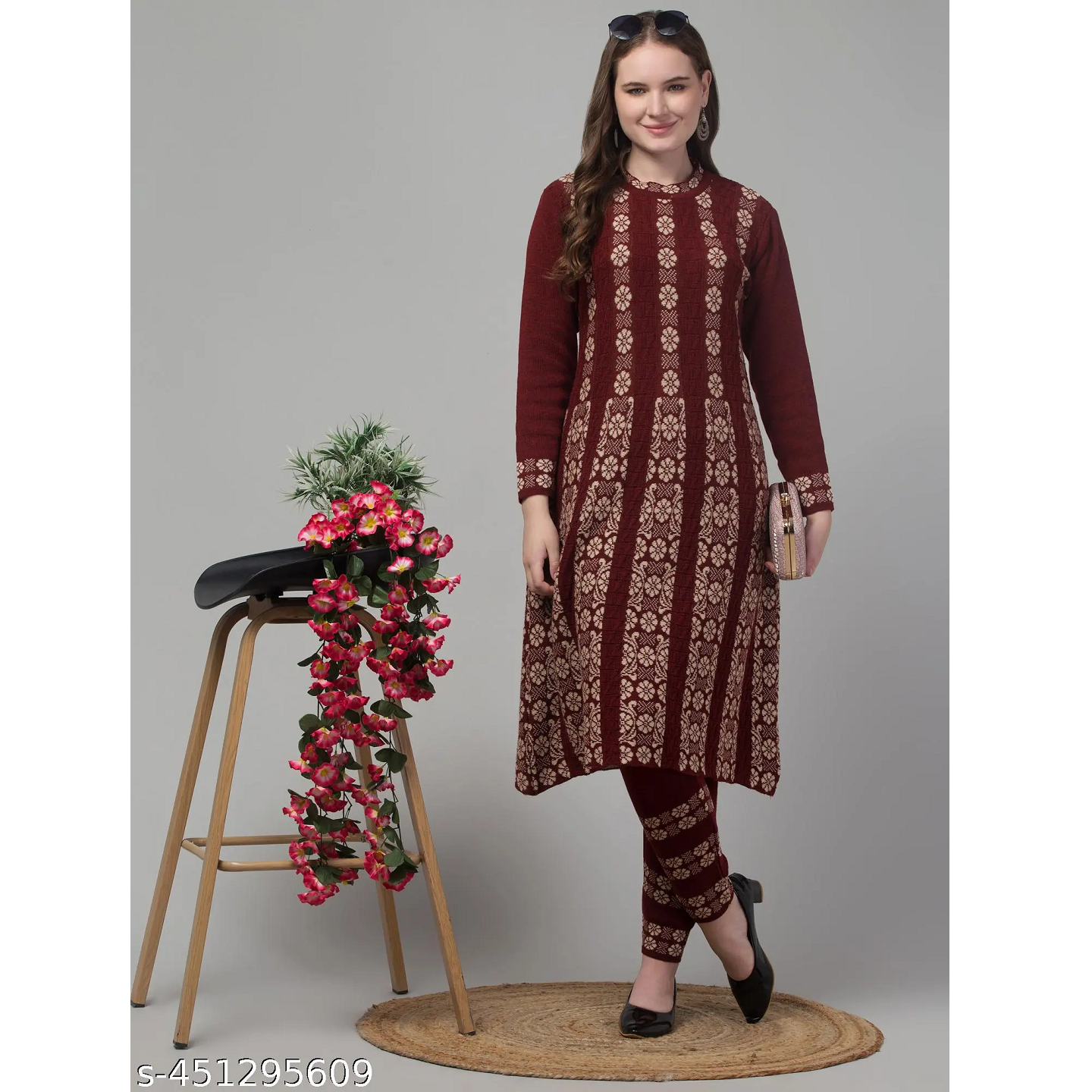 Dark Maroon Knitting Wool A-line Kurta Pant Set