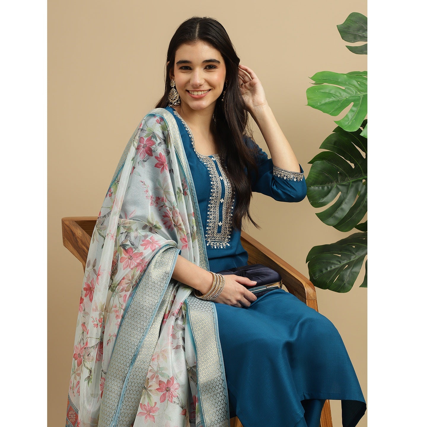 Blue Embroidered Rayon Slub Straight Kurta Pant Dupatta Set